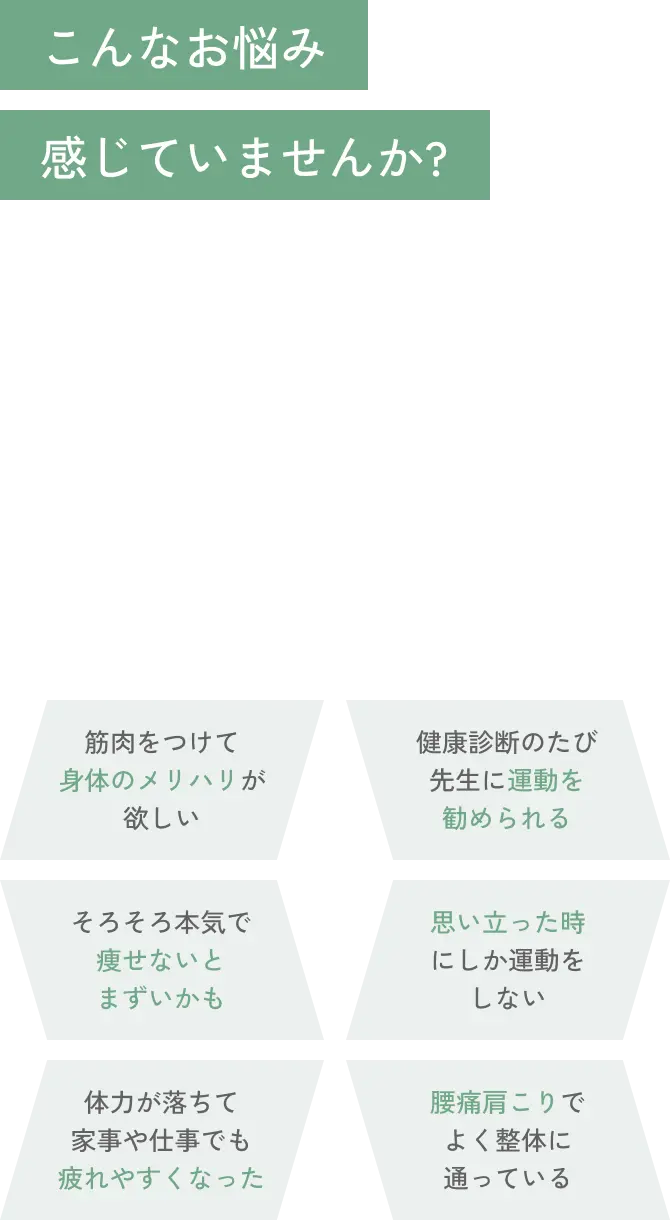 通われる多くの方は、ジムが初めての方や久しぶりに体を動かす方です。「体力に自信がない」「体を動かすのが苦手」そんな不安に寄り添いながら、体調や体力に合わせて進めていきます。